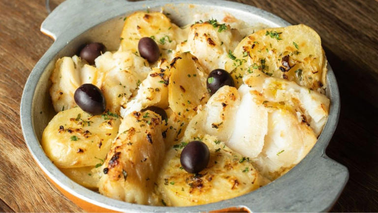 - Quando estiver pronto, passe o bacalhau com os legumes para um recipiente grande e finalize com as azeitonas para decorar.