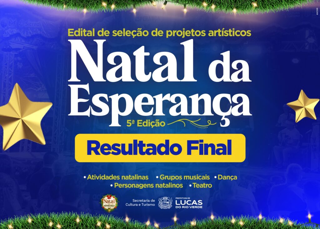 A Secretaria Municipal de Cultura e Turismo de Lucas do Rio Verde divulga, nesta quinta-feira (6), a homologação final dos projetos artístico-culturais selecionados no Edital de Seleção de Projetos Culturais nº 006/2025 denominado “Natal da Esperança – 5ª Edição”.