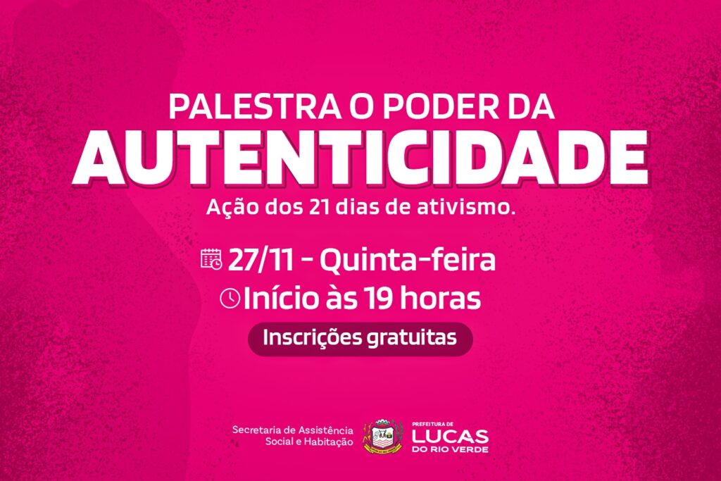 A campanha dos 21 Dias de Ativismo segue com um momento especial em Lucas do Rio Verde: o evento “O Poder da Autenticidade”, que acontece no dia 27 de novembro, às 19h, no Auditório do Paço Municipal. A entrada é gratuita.