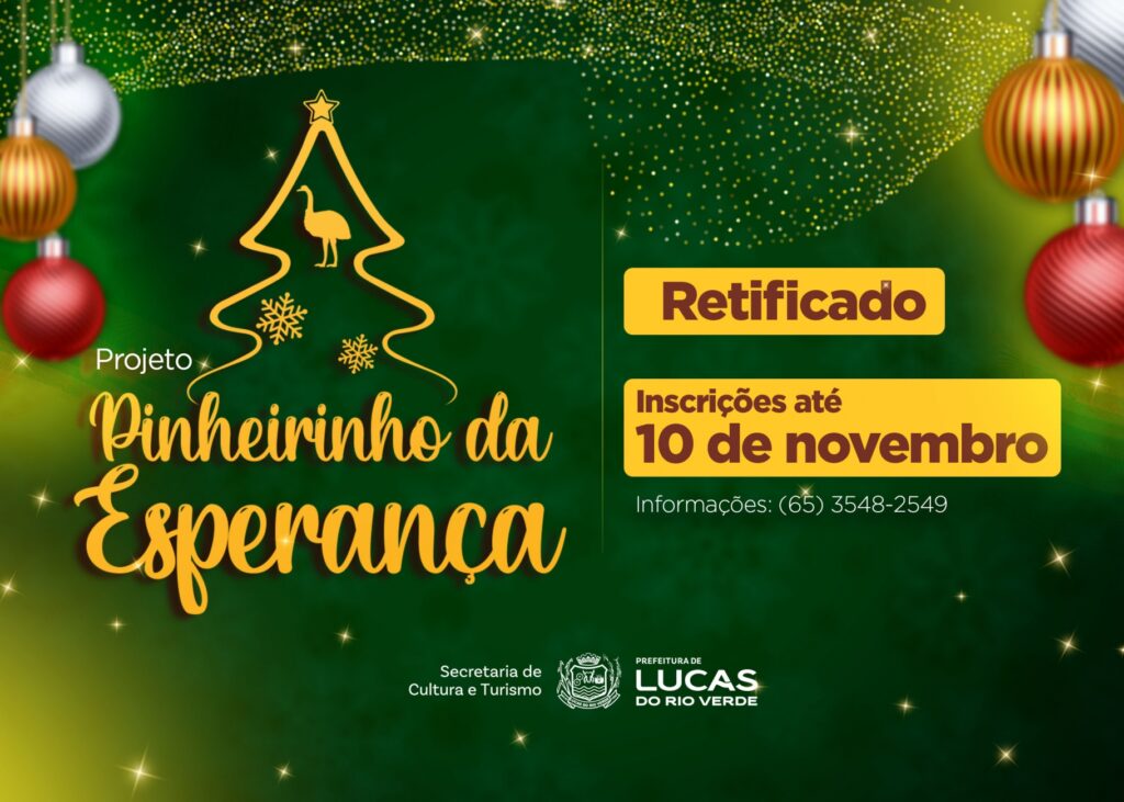 A Secretaria Municipal de Cultura e Turismo de Lucas do Rio Verde divulgou, nesta segunda-feira (3), a Retificação nº 01 do Edital de Seleção nº 008/2025 Pinheirinho da Esperança, que estabelece normas e procedimentos para inscrição, seleção e participação de empresas e comércios locais no concurso de decoração de árvores natalinas.