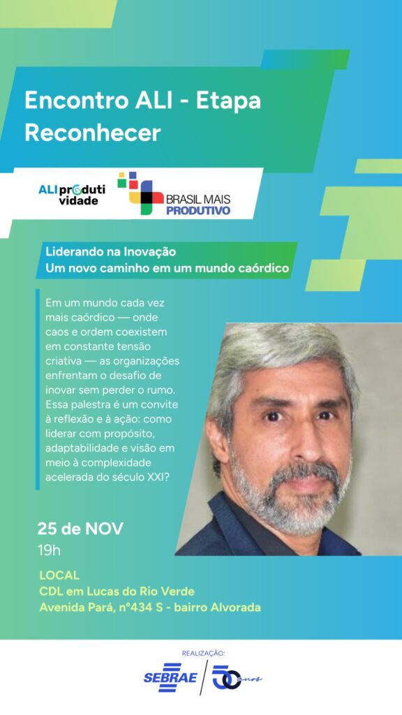 O Sebrae de Lucas do Rio Verde realiza, no próximo dia 25 de novembro, às 19h, o evento “Reconhecer”, último encontro coletivo do programa ALI Produtividade neste ciclo. A atividade será realizada na CDL do município, reunindo empreendedores, agentes de inovação e comunidade interessada em temas ligados ao desenvolvimento empresarial.