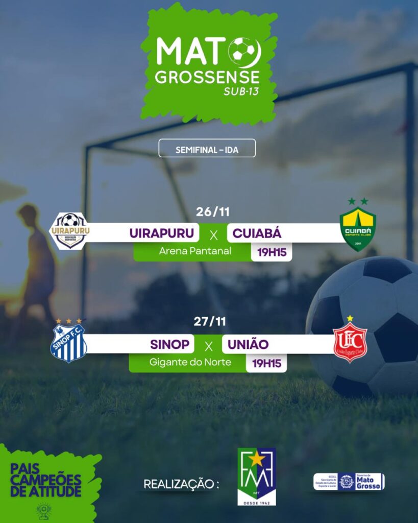 As semifinais do Campeonato Mato-grossense Sub-13 iniciam nesta semana, com os quatro classificados entrando em campo nos jogos de ida na quarta-feira (26) e quinta-feira (27). As partidas serão disputadas na Arena Pantanal e no Estádio Gigante do Norte, abrindo a disputa por uma vaga na grande final.