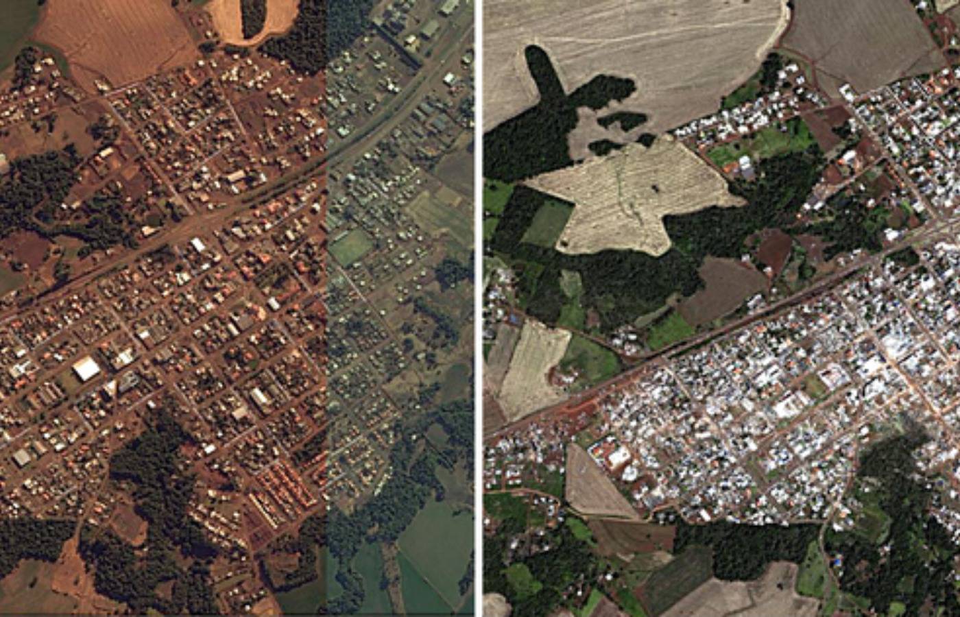 Imagens espaciais e um ortomosaico com o antes e o depois do tornado que atingiu o município de Rio Bonito do Iguaçu, no Paraná, auxiliam a Defesa Civil Nacional a mensurar a dimensão dos danos provocados pelo fenômeno. O material também tem ajudado no planejamento das ações de resposta e reconstrução da cidade.