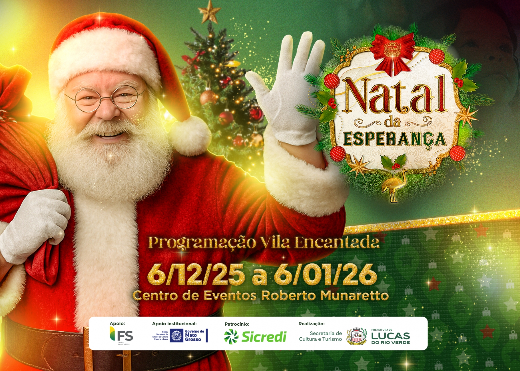 A Prefeitura de Lucas do Rio Verde, por meio da Secretaria de Cultura e Turismo, dá um start inicial no Natal da Esperança 2025 neste sábado (06), às 19h, no Centro de Eventos Roberto Munaretto. Neste ano, a 5ª edição conta com o patrocínio do Sicredi Ouro Verde e apoio da FS.
