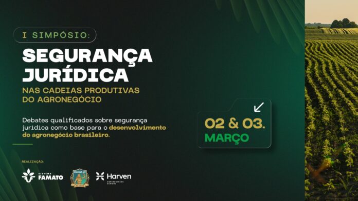 A Federação da Agricultura e Pecuária de Mato Grosso (Famato) realiza, nos dias 2 e 3 de março, o I Simpósio Segurança Jurídica nas Cadeias Produtivas do Agronegócio. A iniciativa ocorre em parceria com a Escola Superior da Magistratura de Mato Grosso (Esmagis-MT) e a Harven Agribusiness School, reunindo representantes do Judiciário, juristas, acadêmicos, produtores rurais e especialistas do setor.