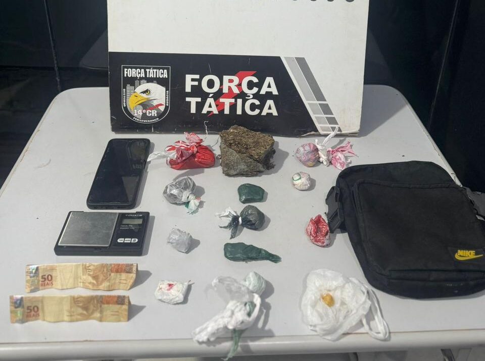 Durante a busca pessoal, os militares encontraram R$ 100 em dinheiro, um aparelho celular e porções de substâncias análogas à maconha, cocaína e pasta base de cocaína nos bolsos da bermuda. Na bolsa, foram localizados ainda nove invólucros e duas porções maiores de maconha, além de uma balança de precisão.