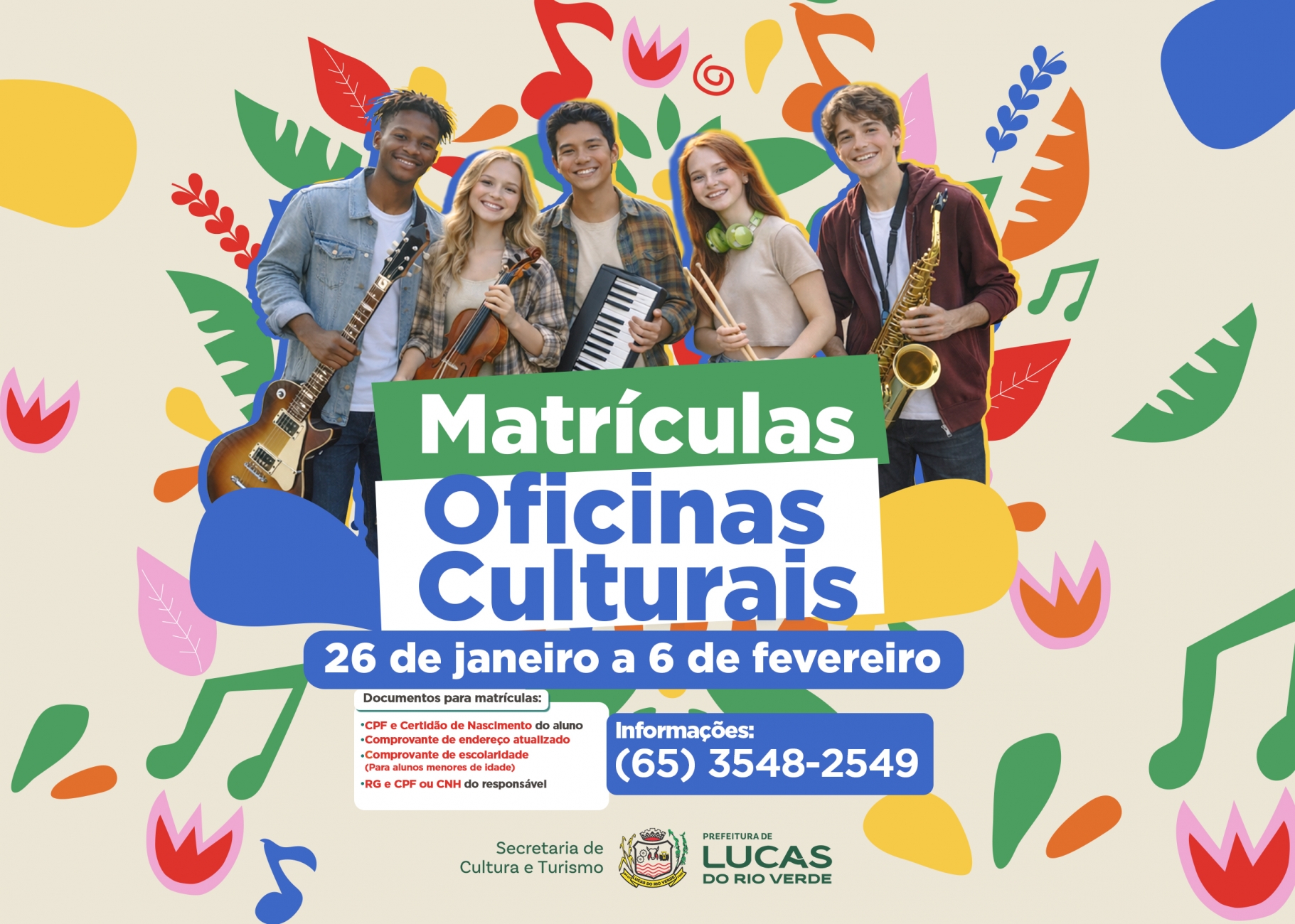 A Prefeitura de Lucas do Rio Verde, por meio da Secretaria de Cultura e Turismo, anuncia a abertura das matrículas para as Oficinas Culturais 2026. A partir do dia 26 de janeiro até 6 de fevereiro, os interessados poderão garantir sua vaga em diversas modalidades artísticas oferecidas pelo município.