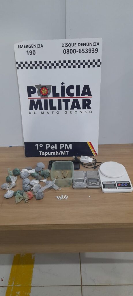 A Polícia Militar do Estado de Mato Grosso apreendeu drogas e materiais relacionados ao tráfico na manhã desta terça-feira (21), durante uma ação realizada no município de Tapurah. A ocorrência foi atendida por uma guarnição do 13º Batalhão de Polícia Militar, com apoio do 1º Pelotão.