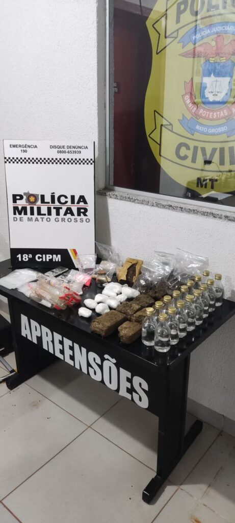A Polícia Militar de Mato Grosso apreendeu uma grande quantidade de entorpecentes e materiais relacionados ao tráfico de drogas na tarde de sábado (4), no bairro Santa Terezinha, em São José do Rio Claro. A ação ocorreu por volta das 17h, durante a Operação Tolerância Zero, realizada pela 18ª Companhia Independente de Polícia Militar (CIPM), vinculada ao 14º Comando Regional.