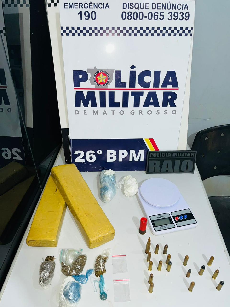 A Polícia Militar prendeu um homem suspeito de envolvimento com o tráfico de drogas na noite desta segunda-feira (5), no Centro de Nova Mutum. A ação foi realizada por equipes do 26º Batalhão de Polícia Militar, com apoio do Grupo Raio, após denúncia anônima recebida via Central de Atendimento 190.
