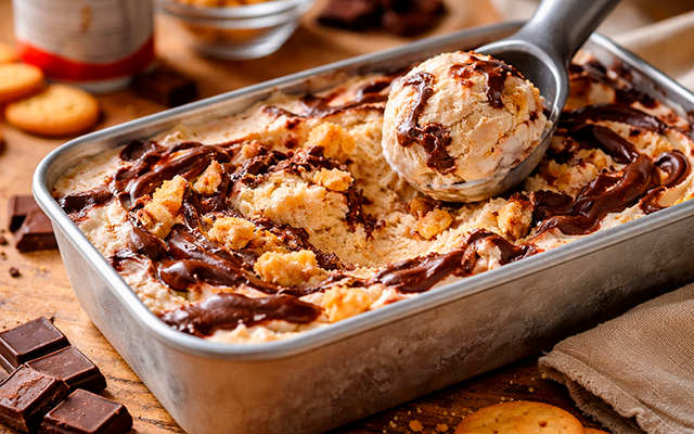 11. Com um palito ou faca, faça movimentos leves para mesclar o chocolate ao sorvete, criando o efeito marmorizado