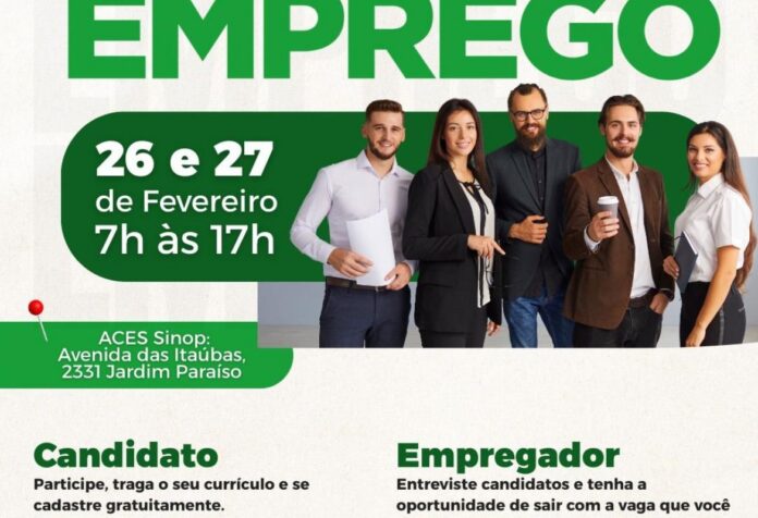 A Associação Comercial e Empresarial de Sinop, realiza, nos dias 26 e 27 de fevereiro, o 1º Feirão de Empregos ACES, uma iniciativa que vai movimentar o mercado de trabalho local ao reunir, em um só espaço, empresas com vagas abertas e candidatos em busca de emprego ou recolocação profissional.