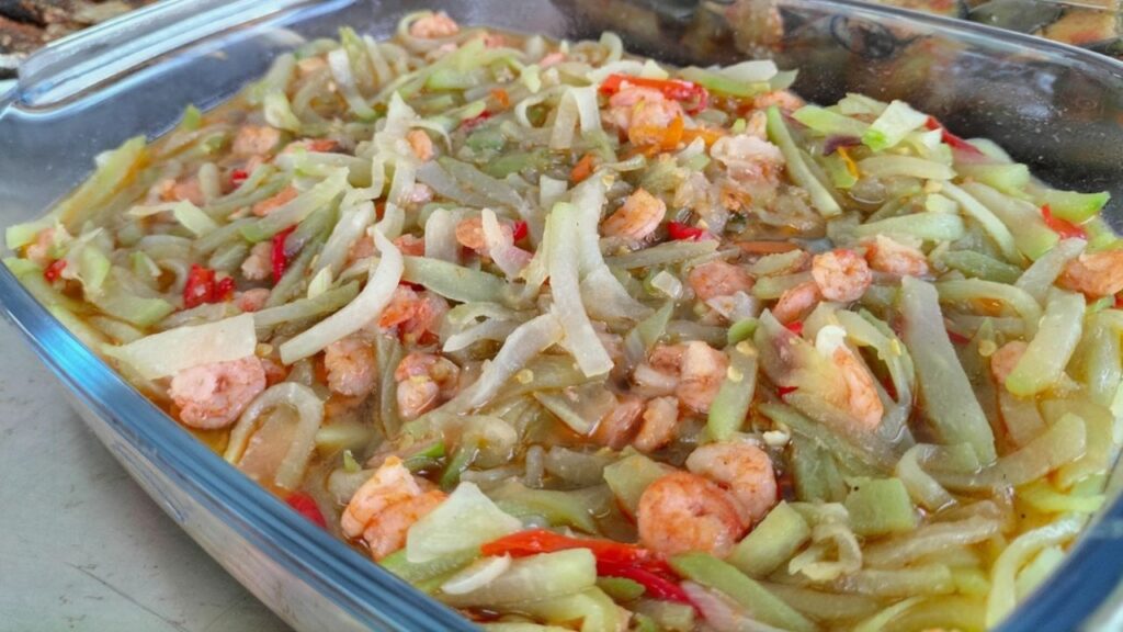 - Acrescente o chuchu, o caldo de legumes ou de camarão e a água quente.