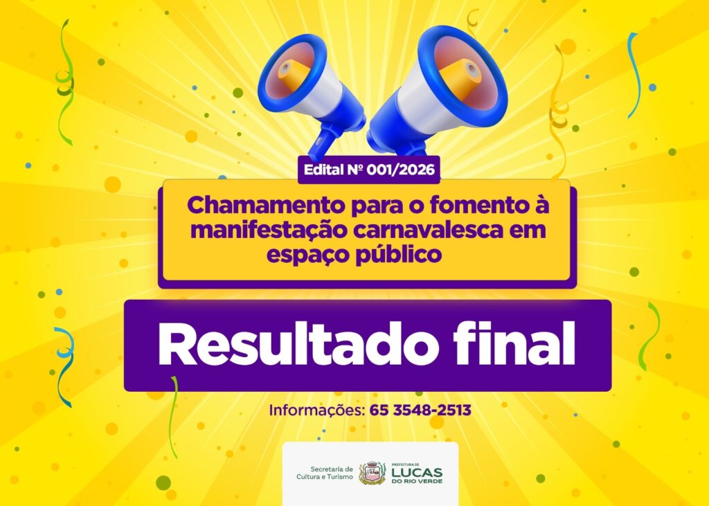 A Secretaria Municipal de Cultura e Turismo (SMCT) de Lucas do Rio Verde publicou, nesta sexta-feira (30), o resultado final do Edital de Seleção nº 001/2026, destinado ao fomento de manifestações carnavalescas em espaço público no município.