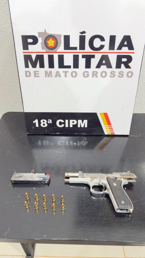 Em posição de segurança, os policiais continuaram a se identificar, momento em que um homem de 46 anos saiu da residência com uma arma em punho, baixando-a apenas ao perceber a presença da equipe. Foi constatado que se tratava de uma pistola sem documentação.