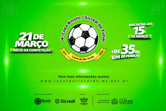 Estão abertas, a partir desta terça-feira (24), e seguem até o dia 15 de março as inscrições para a 14ª edição da Copa Binotti/Sicredi de Futsal. A competição reunirá equipes de Lucas do Rio Verde e os Distritos de Primavera do Norte e Comunidade Morocó, ambos localizados em Sorriso.