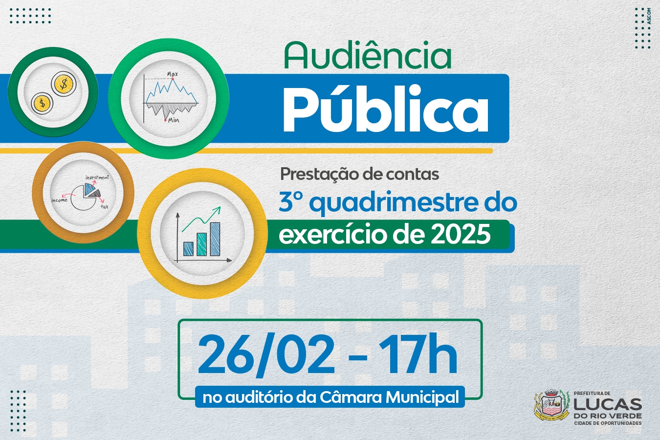 Em conformidade com a Lei de Responsabilidade Fiscal nº 101/2000, a Prefeitura de Lucas do Rio Verde, por meio da Secretaria de Desenvolvimento Econômico, Planejamento e Cidade, realizará uma audiência pública para a prestação de contas do 3º quadrimestre do exercício de 2025. O evento acontecerá nesta quinta-feira (26), no auditório da Câmara de Vereadores, com início às 17h, e transmitida, de forma on-line, através do canal do Legislativo Municipal no youtube.
