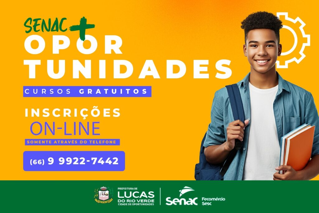 A Prefeitura de Lucas do Rio Verde, em parceria com o Senac, está com inscrições abertas para dois novos cursos gratuitos por meio do programa Senac Mais Oportunidades. As oportunidades são para as formações de Assistente Administrativo e Alongamento de Cílios, com início no dia 23 de fevereiro de 2026. As vagas são limitadas e as inscrições devem ser feitas exclusivamente pelo WhatsApp.