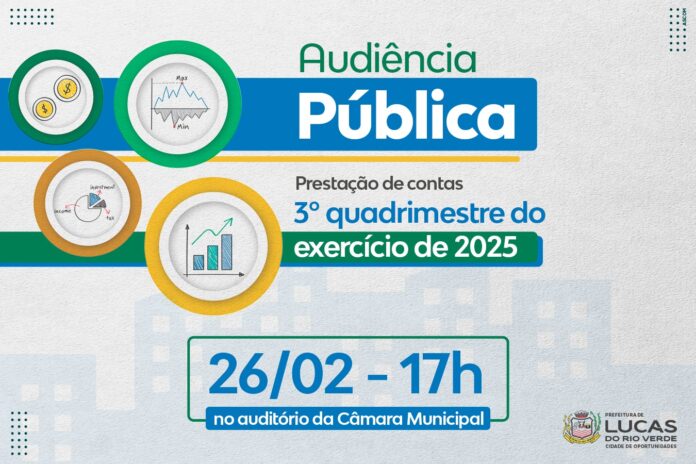 Em conformidade com a Lei de Responsabilidade Fiscal nº 101/2000, a Prefeitura de Lucas do Rio Verde, por meio da Secretaria de Desenvolvimento Econômico, Planejamento e Cidade, realizará uma audiência pública para a prestação de contas do 3º quadrimestre do exercício de 2025. O evento será no dia 26 de fevereiro, no auditório da Câmara de Vereadores, com início às 17h, e transmitida, de forma on-line, através do canal do Legislativo Municipal no youtube.