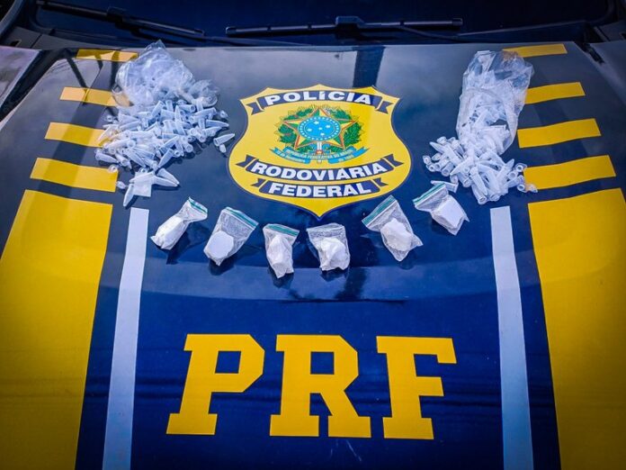 A equipe deu ordem de parada a um veículo de passeio que trafegava pela rodovia e, após os procedimentos de verificação, realizou busca no automóvel. Durante a fiscalização, foram localizados 214 pinos plásticos vazios, comumente utilizados para acondicionamento de entorpecentes, além de seis porções de substância análoga à cocaína e uma porção de substância análoga à maconha.
