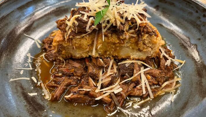 - 2.Finalize com a carne cozinha por cima assim que sair do forno. Adicione queijo ralado e salsa picada a gosto por cima.