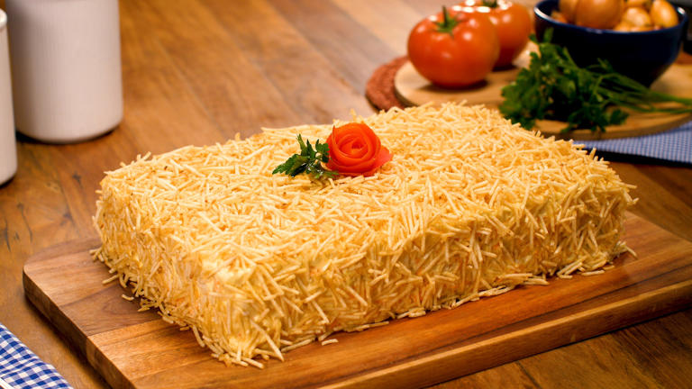 - Cubra todo o bolo com a maionese restante e finalize com bastante batata palha por cima.