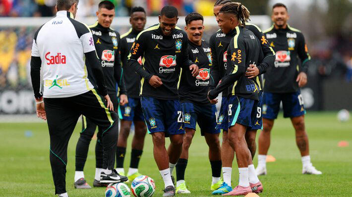 Há mudanças no ataque, mas não no sistema de jogo. Segue o conjunto verde e amarelo com quatro atacantes, entre eles Vini Jr, contestado pela apresentação ruim ante a França, e Matheus Cunha, que tem atuado quase como um meia.