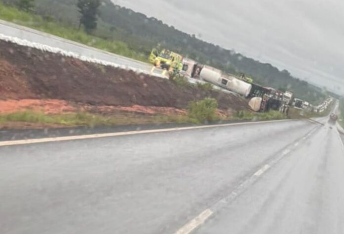 Uma carreta-tanque tombou na madrugada desta segunda-feira (9) no km 568 da BR-163, em Nova Mutum, causando a interdição total da pista no sentido norte da rodovia por quase três horas.
