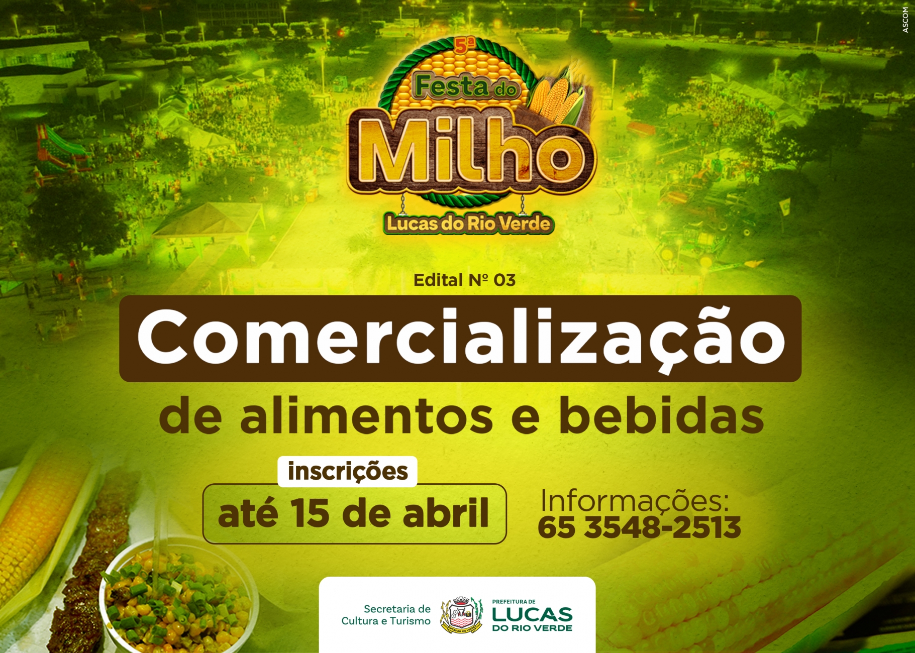 A Prefeitura de Lucas do Rio Verde, por meio da Secretaria de Cultura e Turismo, informa que estão abertas as inscrições para os interessados em participar do Edital de Seleção Nº 003/2026, que trata da exploração comercial de alimentos e bebidas na praça de alimentação da “5ª Festa do Milho, marcada para os dias 09 e 10 de maio de 2026.