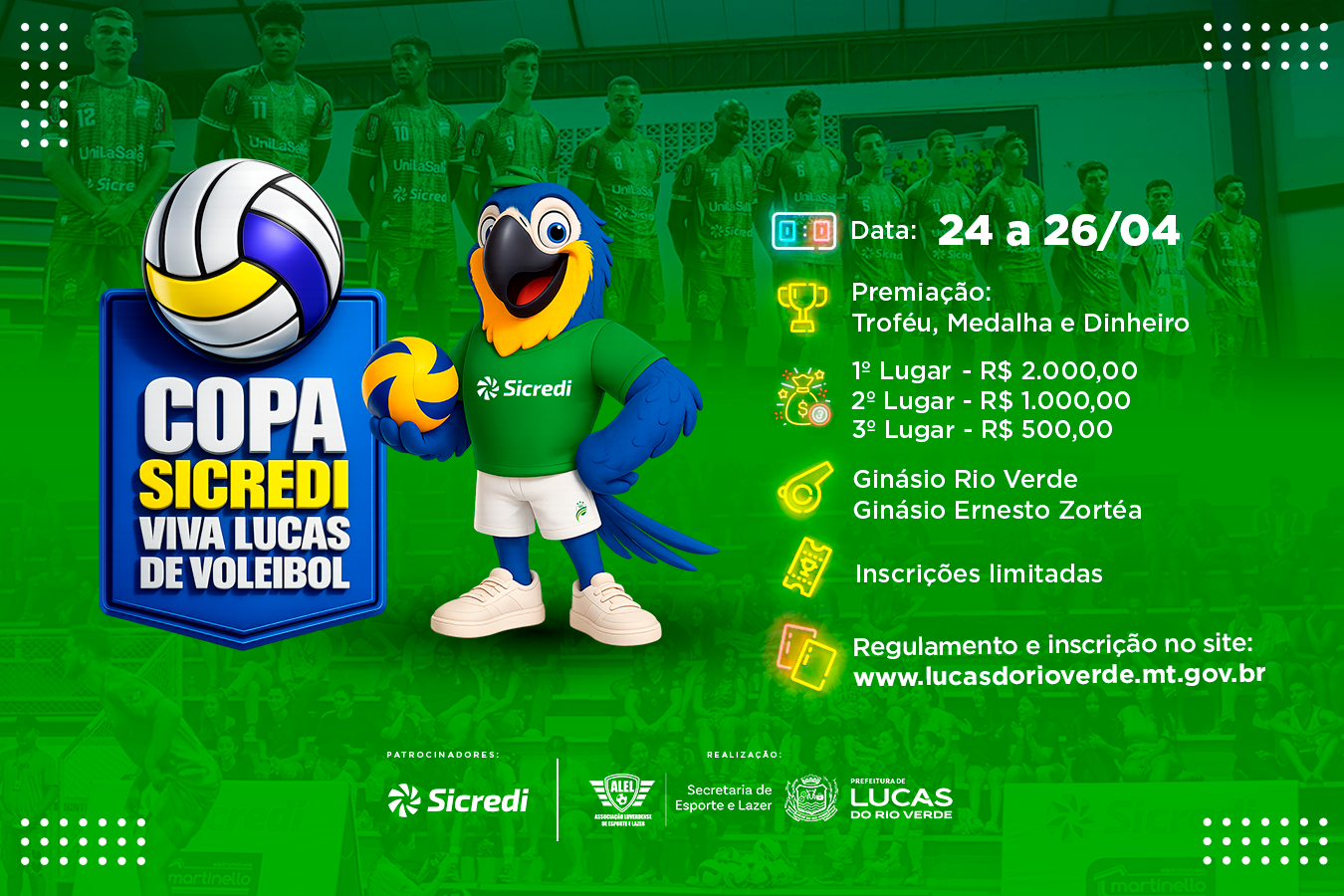Atletas e equipes de voleibol de todo o estado já podem se preparar para mais uma grande competição em Lucas do Rio Verde. Estão abertas, a partir desta terça-feira (10), as inscrições para a Copa Sicredi/Viva Lucas de Voleibol 2026, que será realizada de 24 a 26 de abril.