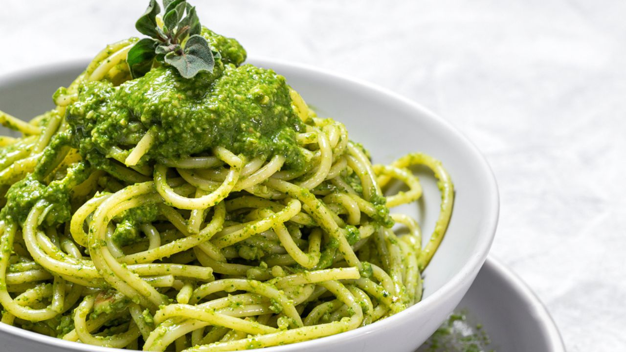 Limpe a lateral do liquidificador com aproximadamente 1 concha da água do cozimento reservada, agite e regue o macarrão. Misture, polvilhe com parmesão e sirva.