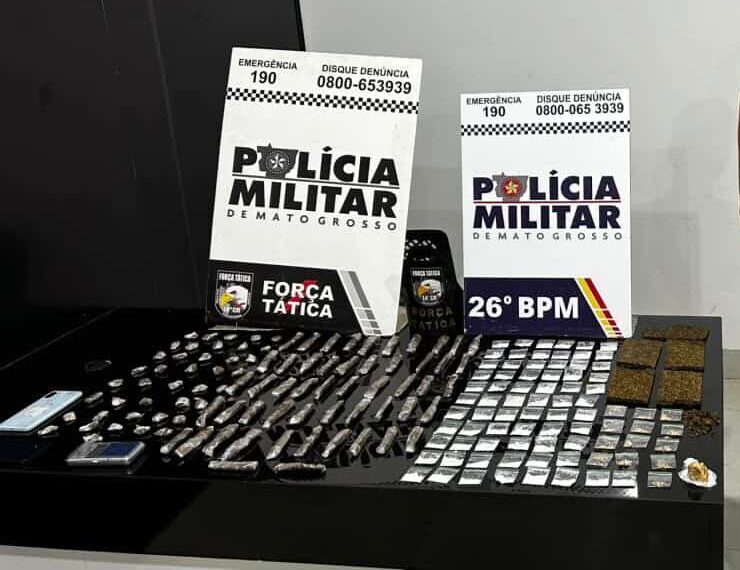 Uma ação da Polícia Militar resultou na apreensão de entorpecentes, materiais utilizados no tráfico e um simulacro de arma de fogo na sexta-feira (27), em Nova Mutum. A ocorrência foi registrada durante o 1º turno de serviço, no âmbito da Operação Força Total – Centro Seguro.