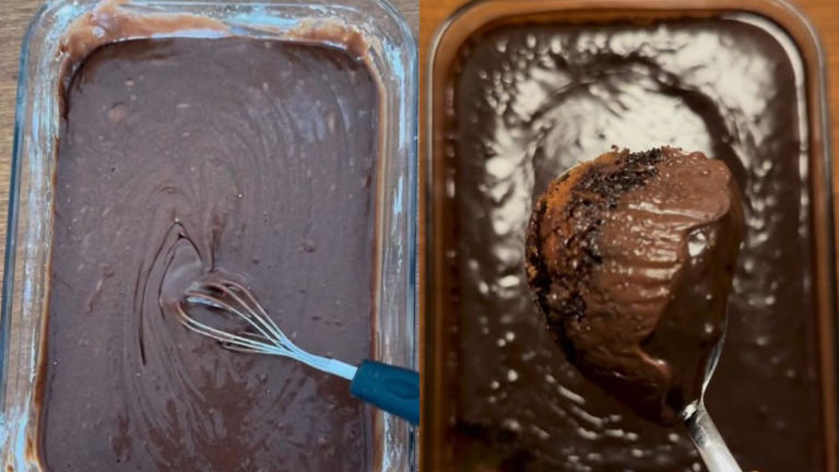 - Enquanto o bolo assa, faça a cobertura derretendo o chocolate (em micro-ondas ou banho-maria) e misturando com o creme de leite.