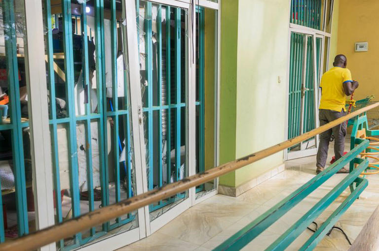 Trabalhador limpa destroços de vidro quebrado após o impacto da explosão em um depósito de munição militar 01/04/2026 REUTERS/Evrard Ngendakumana © Thomson Reuters