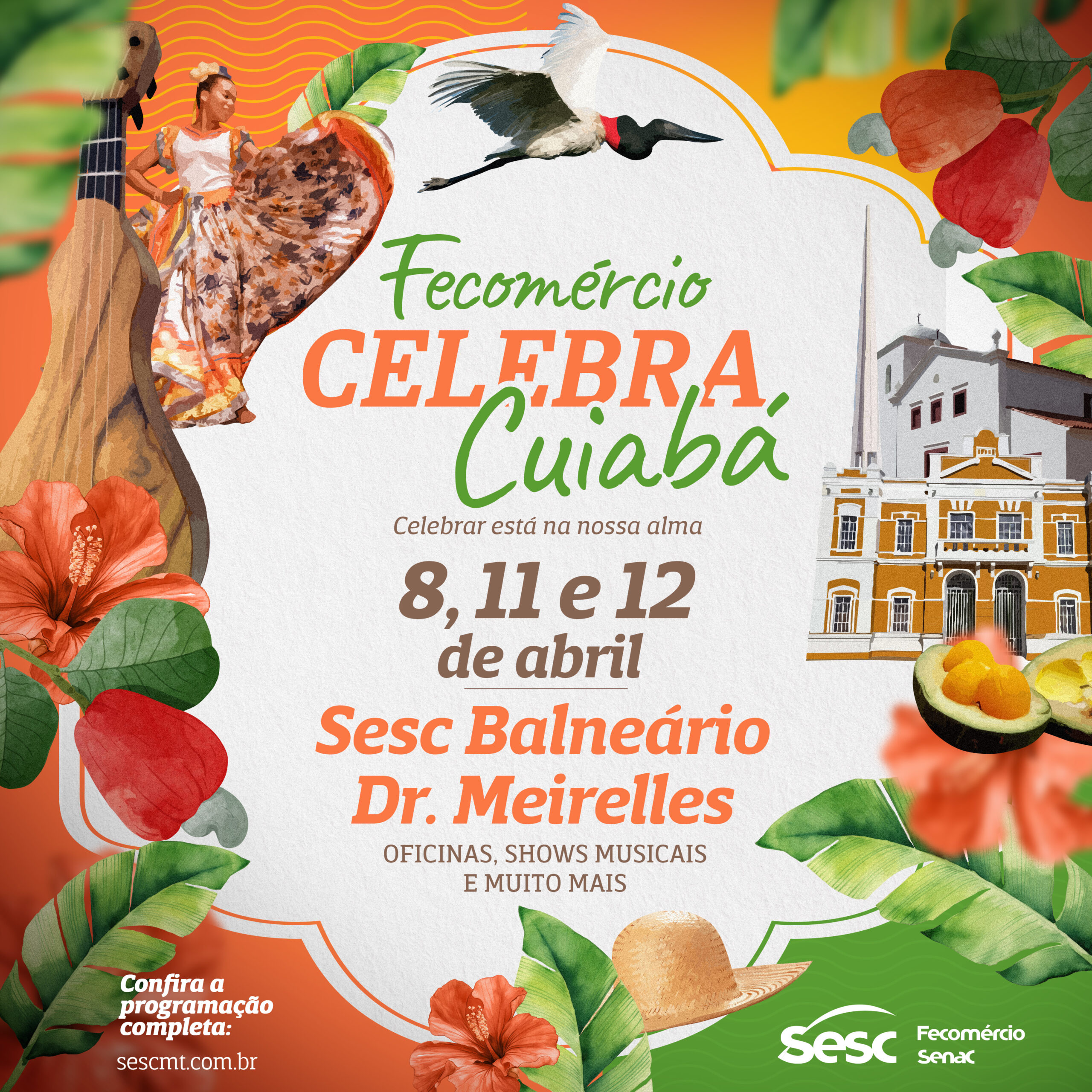 Nos dias 8, 11 e 12 de abril, o Sesc Balneário Dr. Meirelles comemora, junto ao público, o aniversário de 307 anos de Cuiabá, por meio do evento ‘Fecomércio Celebra Cuiabá 2026’. Serão três dias de lazer e diversão para toda a família. Confira abaixo a programação completa.