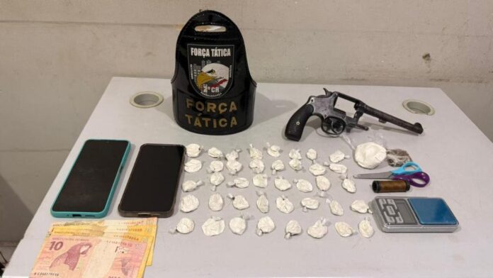 O suspeito, ao ver a presença policial, fugiu para o interior do imóvel. Em seguida, a equipe realizou a abordagem em um dos cômodos. Na ação, os militares localizaram um revólver calibre .38 em poder do suspeito e duas porções de maconha e duas de cocaína.