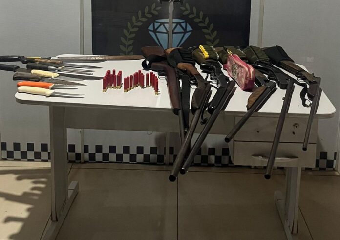 Em buscas pessoais e nos veículos, foram encontradas diversas armas de fogo, incluindo espingardas de fabricação artesanal e industrial, além de munições de diferentes calibres e armas brancas. Segundo os envolvidos, o grupo estava na região com a finalidade de caça.