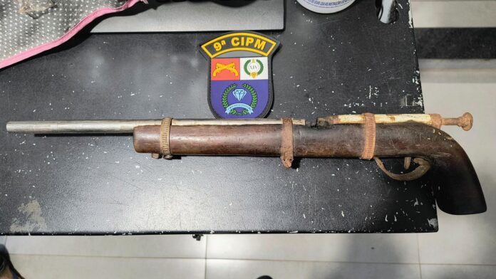 Durante a verificação, os policiais localizaram e apreenderam uma arma de fogo sem numeração de registro, com características de fabricação artesanal.