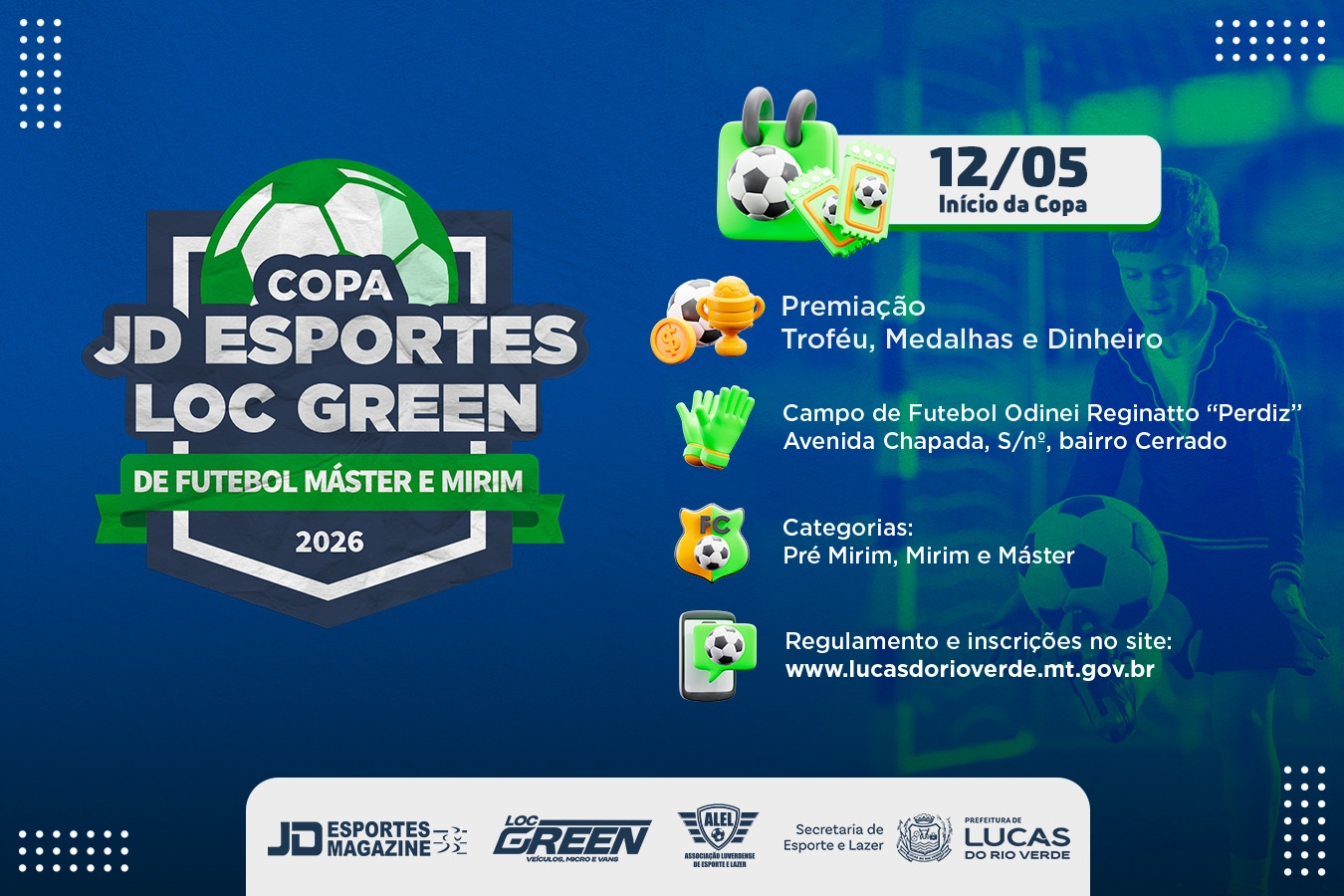 A Prefeitura de Lucas do Rio Verde, por meio da Secretaria de Esporte e Lazer, está com inscrições abertas para a Copa Municipal JD Esporte / Loc Green de Futebol Máster e Mirim 2026. A competição terá início no dia 12 de maio, sendo destinada para público masculino.