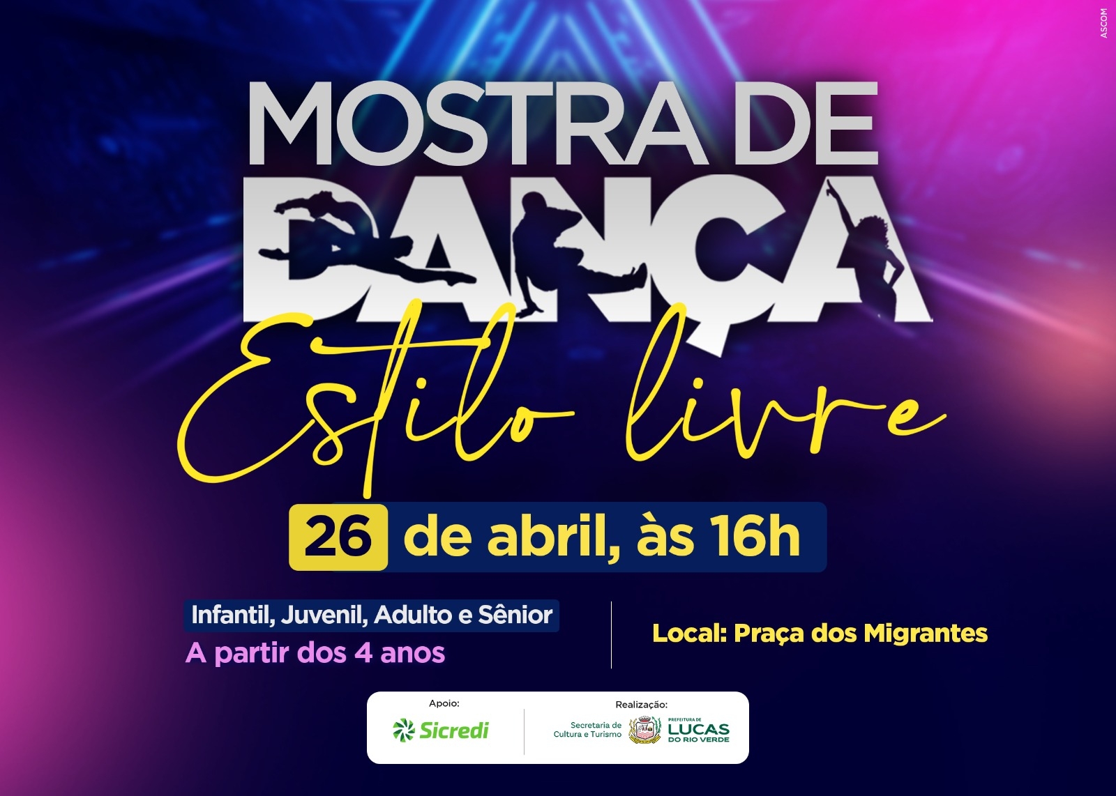 A Prefeitura de Lucas do Rio Verde, por meio da Secretaria Municipal de Cultura e Turismo, realiza neste domingo (26), a partir das 17h, na Praça dos Migrantes, a Mostra de Dança. O evento é aberto ao público e tem como objetivo valorizar, difundir e incentivar as diversas linguagens da dança presentes no município, além de promover a integração entre artistas, grupos e escolas.