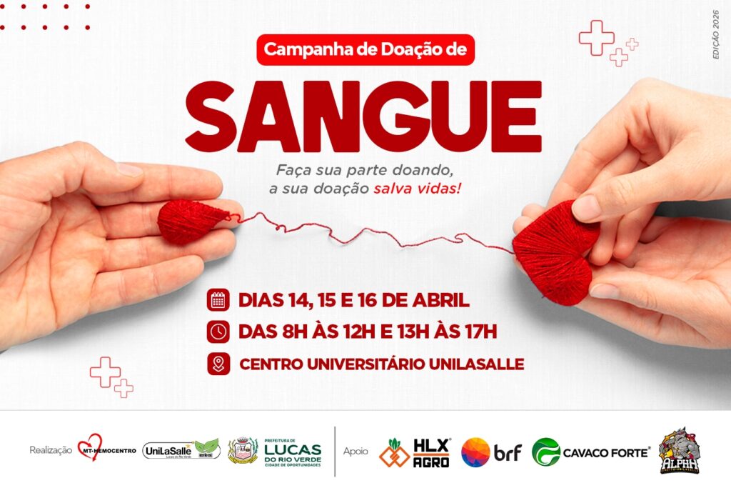 A Prefeitura de Lucas do Rio Verde, o Centro Universitário Unilasalle e o MT Hemocentro realizam nos dias 14, 15 e 16 de abril uma Campanha de Doação de Sangue.