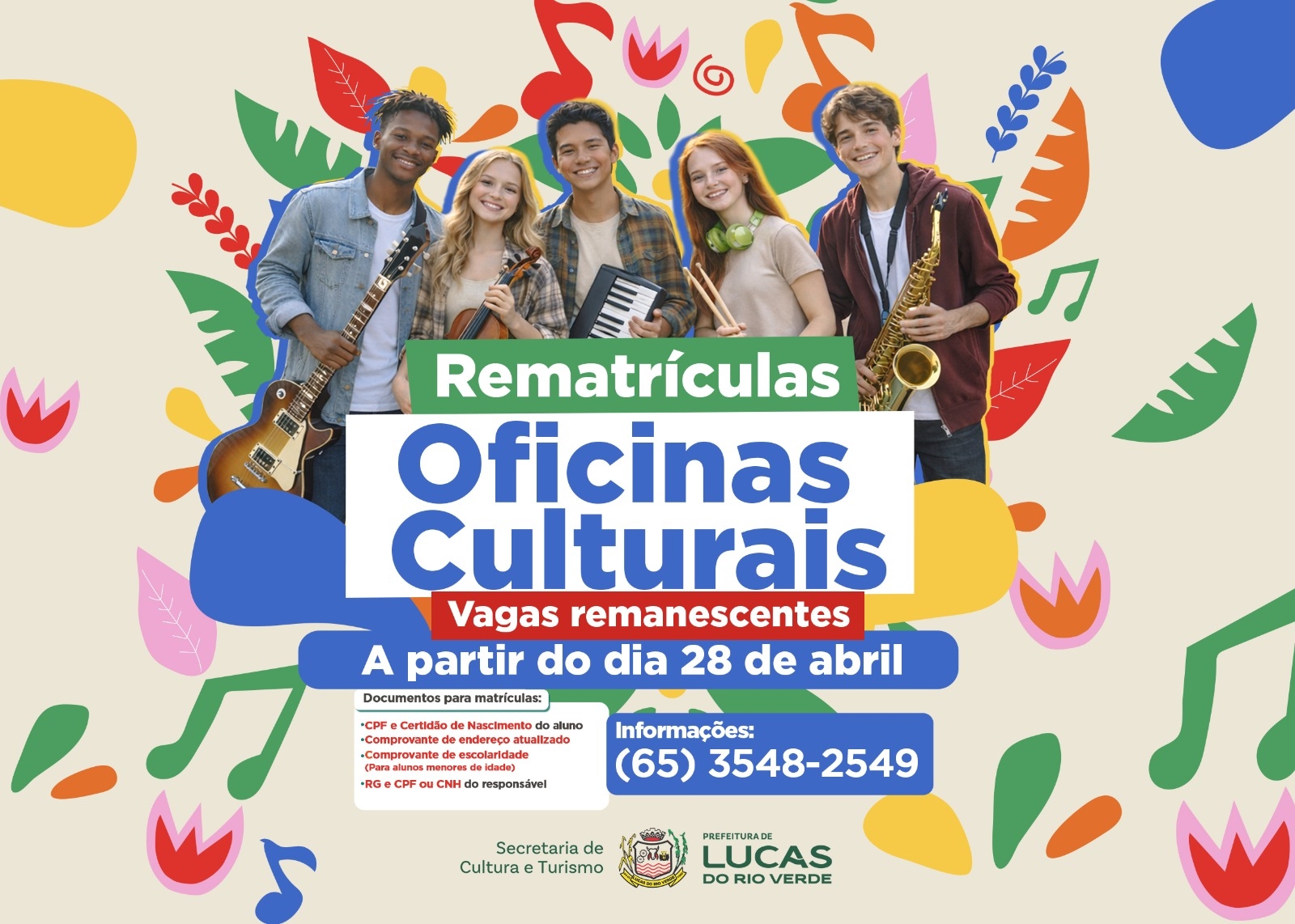 A Prefeitura de Lucas do Rio Verde, por meio da Secretaria de Cultura e Turismo, abre nesta terça-feira (28) as inscrições para as vagas remanescentes das oficinas culturais em 2026. Os interessados devem garantir a participação exclusivamente de forma on-line, por meio do link: https://cultura.lucasdorioverde.mt.gov.br/portal#/
